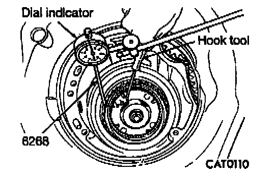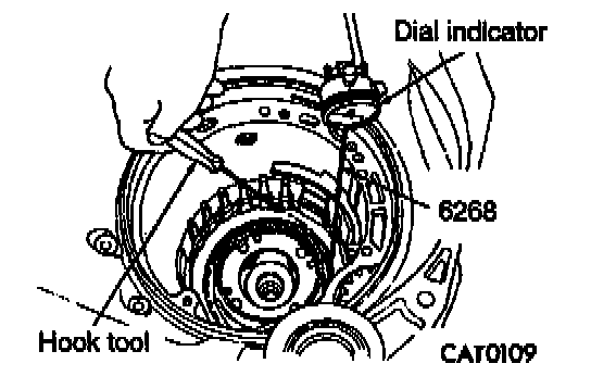 56. Check clutch clearance. Set up Dial Indicator using Dial Indicator Tip 6268 as shown. Press down on the clutch pack with finger and zero dial indicator. Raise one clutch disc with a hook tool. Read the dial indicator.