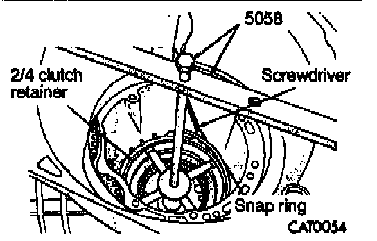 64. Install Spring Compressor 5058. Using a screwdriver, install the 214 clutch retainer snap ring.