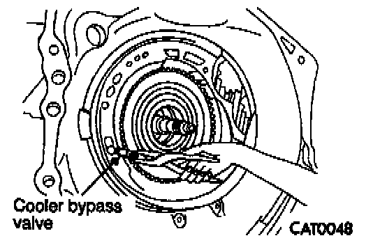 CAUTION: The cooler bypass valve must be replaced if a transaxle failure has occurred. Do not reuse or attempt to clean old valve. When installing bypass value, Insert with O-ring end toward rear of case.