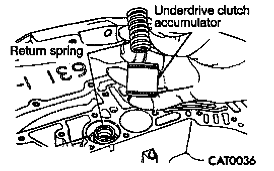 82. Install return spring and two seal rings from the overdrive and underdrive clutch accumulator pistons.