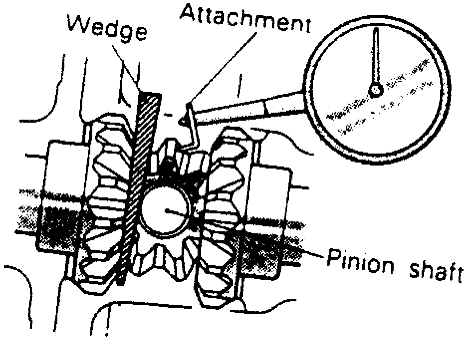 4. On models except Stealth, lock side gear with a wedge as shown, then measure differential gear backlash with dial indicator on pinion gear. Differential gear backlash should not exceed 0.008 inch.