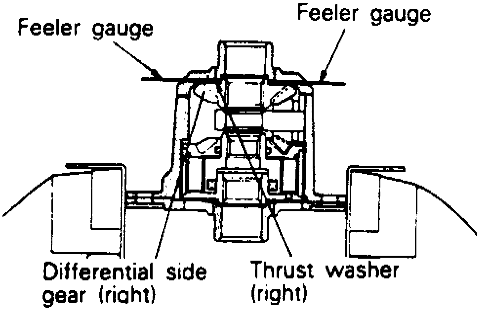 6. Differential gear backlash (clearance in thrust direction of side gear) should be within 0.0012-0.0035 inch (.03 mm-0.09 mm). If clearance in the thrust direction of the side gear is within standard value range, backlash of differential gear is normal.