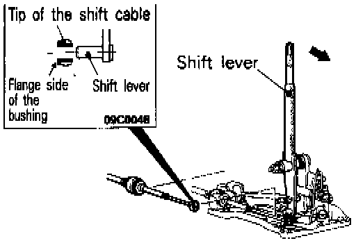 2. Pull the shift lever at the passenger compartment side fully in the direction shown in the illustration (4th gear position), and install the shift cable to the shift lever at the passenger compartment side. Furthermore, install the resin bushing on the tip of the shift cable so that the flange side is facing the split pin.