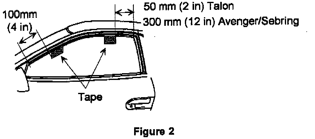1. Apply a piece of masking tape along the quarter window molding as shown in Figure 1. Make a mark on the tape 65 mm (2.5 in) below the top weather strip seam for Talon and 100 mm (4 in) for Avenger/Sebring. Make another mark on the tape 100 mm (4 in) below the first.