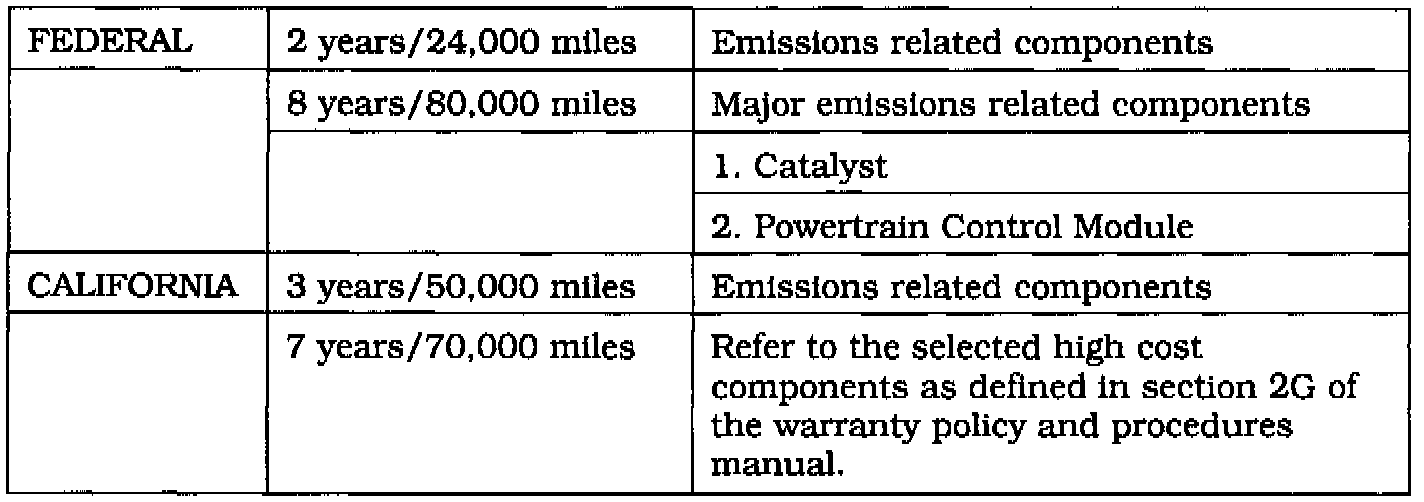 Emissions related components must remain operable for the useful life of the system. This is defined as ten years or 100,000 miles, whichever comes first, for both federally and California certified vehicles. Chrysler must demonstrate that emission systems are durable enough to meet this requirement before the government will certify these vehicles for sale.Warranty periods as required by the legislation are indicated in the chart above.