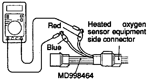 2. Make sure that there is continuity [Approx. 12 ohms at 2O°C (68°F)] between terminal 1 (red clip of special tool) and terminal 3 (blue clip of special tool) on the heated oxygen sensor connector.