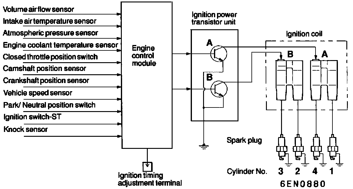 This system is provided with two ignition coils (A and B) and two [1][2]ignition power transistors (A and B) for the No. 1 and No. 4 cylinders, and No. 2 and No. 3 cylinders respectively.