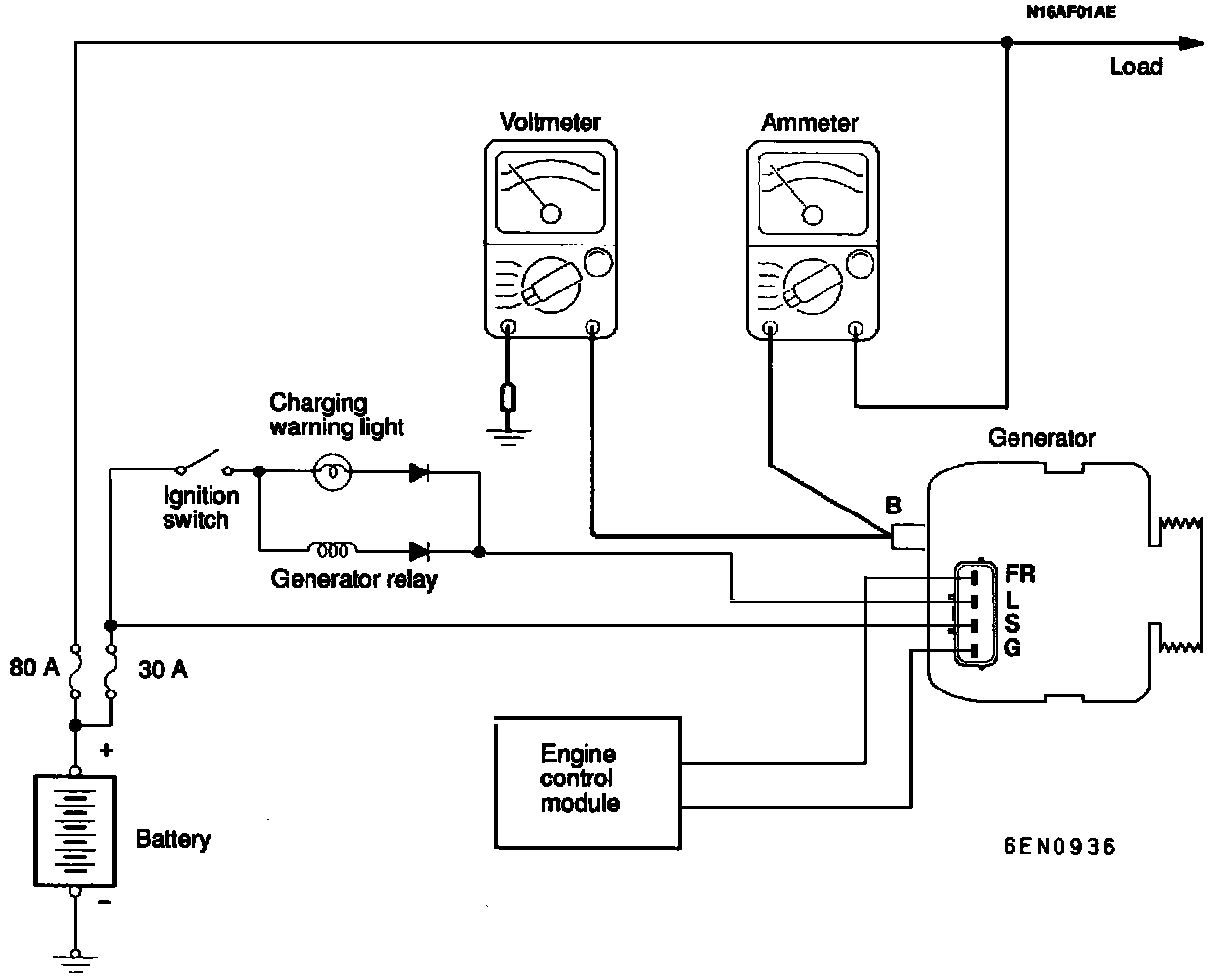 - If the electrical load is small while testing, the specified level of current may not be output even though the generator is normal. In such cases, increase the electrical load by leaving the headlights turned on for some time to discharge the battery or by using the lighting system in another vehicle, and then test again.