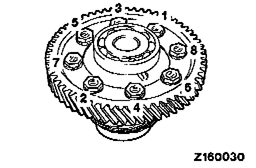 Apply ATF to the differential drive gear bolts, install and tighten to the specified torque in the order shown in the figure.