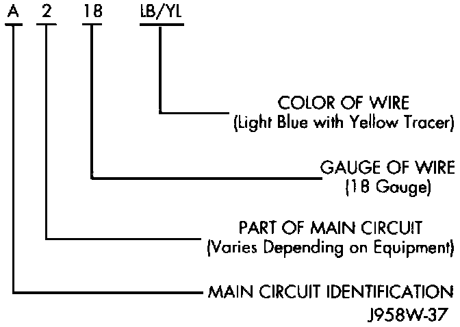 Each wire shown in the diagrams contains a code which identifies the main circuit, part of the main circuit, gauge of wire, and color. The color is shown as a two-letter code, which can be identified by referring to the Wire Color Code chart. If the wire has a tracer and it is a standard color, an asterisk will follow the main wire color. If the tracer is non-standard, the main wire color will have a slash (/) after it, followed by the tracer color