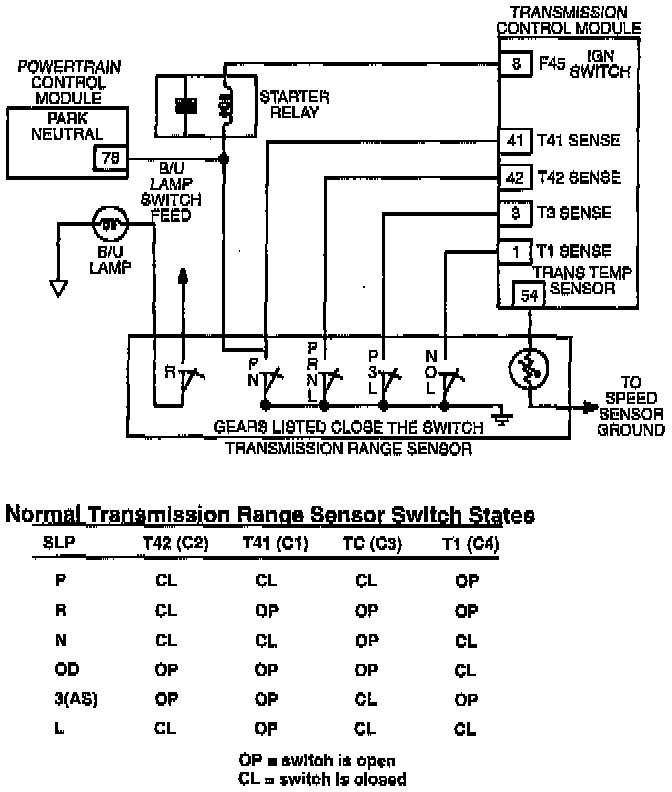 The TCM identifies the position of the manual lever by comparing the current switch positions of the Transmission Range Sensor (TRS). This is accomplished by logic circuitry within the TCM. The primary function of SLP logic is to provide safe, continuous, but limited operation of the transaxle with the presence of an invalid or transition input code. The SLP logic function screens the input codes from the switches and provides an SLP output signal to control actual gear selection.
