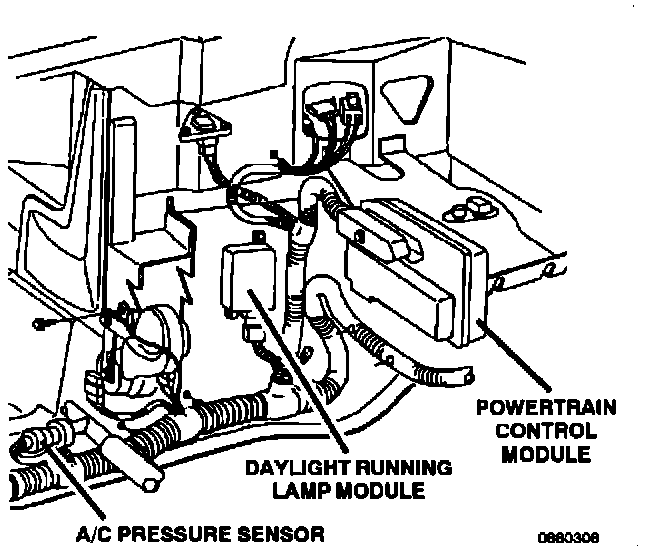 PCM, Daylight Running Lamp Module & A/C Pressure Sensor Locations: