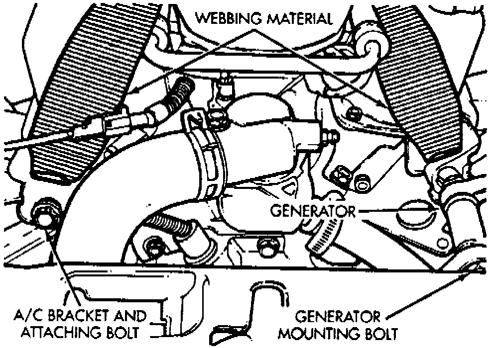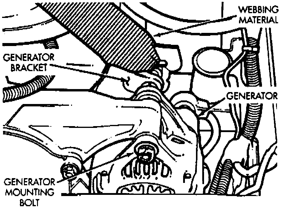b. Loosen, but do not remove, generator to engine bolt. Remove spacer between generator and engine. Install webbing material hook between generator and engine, then install and tighten bolt.