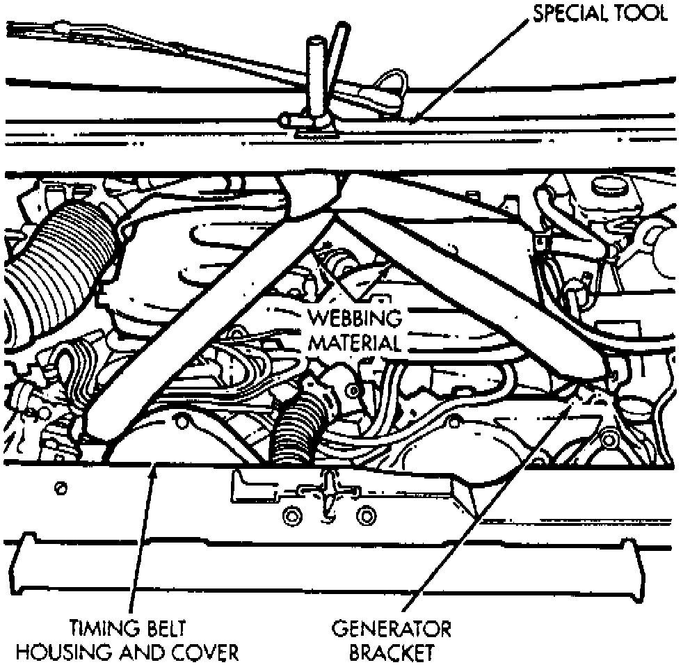 3. Securely attach pieces of webbing material to hook on engine holding fixture. Tighten hook on fixture until all slack is removed from all webbing material.
