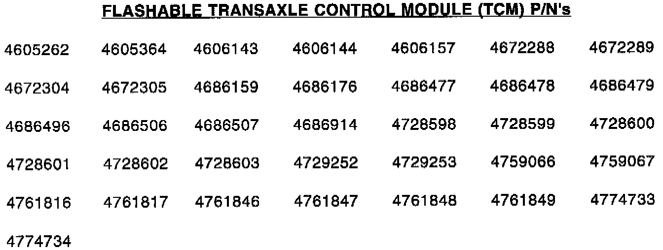 Some vehicles that have had service controllers installed can be flashed. Therefore, ALWAYS CHECK THE PART NUMBER TO BE SURE THAT A FLASHABLE TCM IS NOT REPLACED.