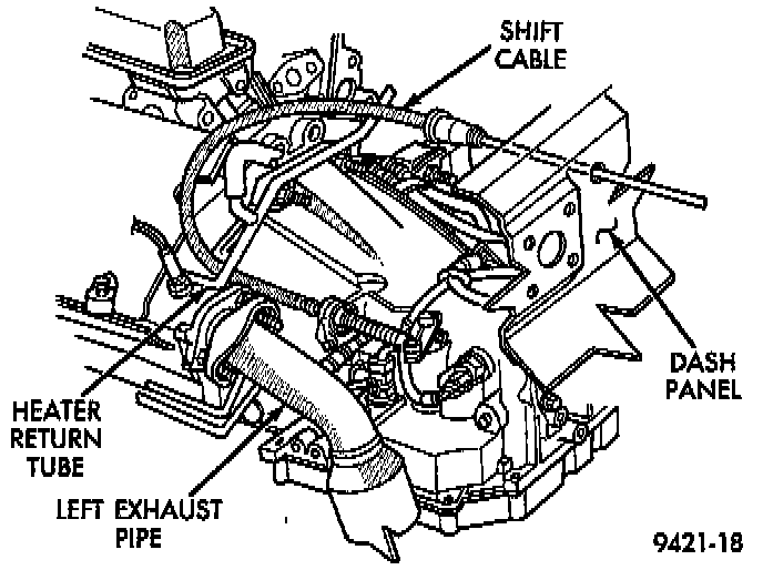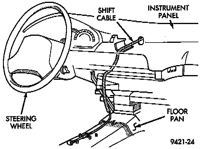 8. Route transaxle shift cable under A/C duct, over central distribution duct, through support strut and air bag mounting bracket. Then route over carpeting and down to the shifter bracket.