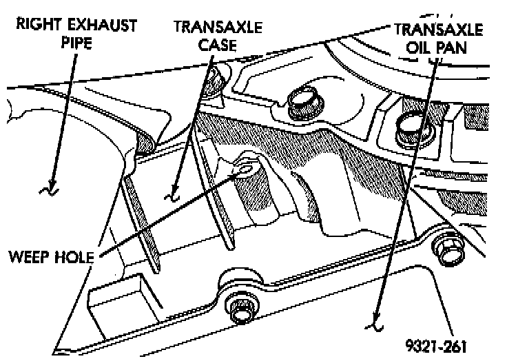 There are two seals at the boundary of the two sumps. There is a weep hole in the right side of the transaxle case which vents the area between the two seals. If oil is leaking from the weep hole, there is at least one seal leaking. Never plug the weep hole to correct a leaking condition. Plugging the weep hole could result in contaminating one or both transaxle Bumps, low oil level, poor transaxle performance or transaxle failure. In order to correctly repair this type of leak the transaxle must be removed from the vehicle and both transfer shaft seals replaced.