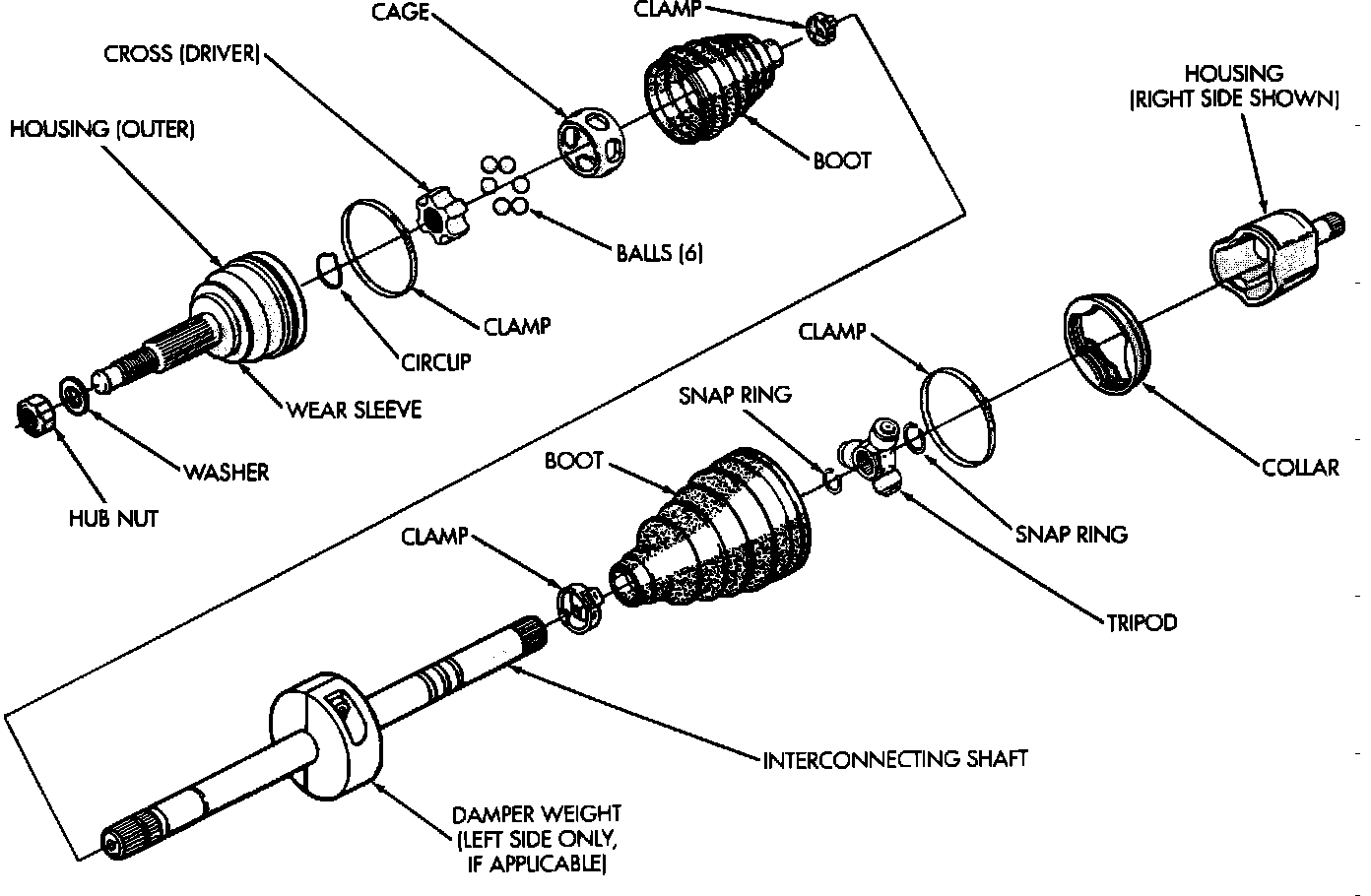 The driveshaft assembly, is a non-serviceable item, except for the inner and outer driveshaft boots. If any failure of internal components is diagnosed during a road test or disassembly, the driveshaft will need to be replaced as an assembly.