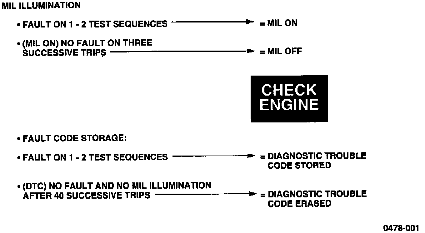The above legislation requires that the driver be informed when an emissions related system or component malfunctions or deteriorates to the extent that vehicle emissions exceed certain thresholds. To do this, the malfunction indicator or CHECK ENGINE light on the instrument panel is illuminated. The law states that the Malfunction Indicator Light (MIL) must be illuminated no later than the end of a second consecutive trip in which a failure of this type is observed, and illuminated immediately if catalyst damage is about to occur due to engine misfire.