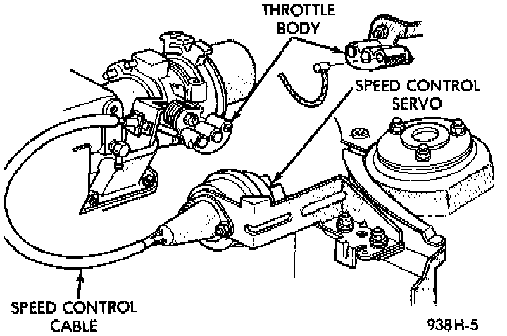 The speed control servo cable is connected between the speed control vacuum servo diaphragm and the throttle body control linkage. This cable causes the throttle control linkage to open or close the throttle valve in response to movement of the vacuum servo diaphragm.