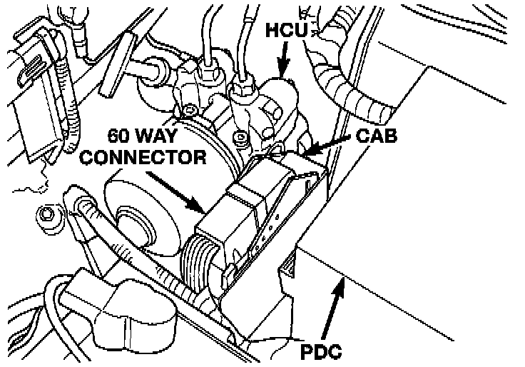 The CAB used on both the Teves Mark IV-G ABS and ABS with traction control, is mounted and electrically connected directly to the Hydraulic Control Unit HCU assembly. To remove the CAB from the HCU for replacement, it is necessary to remove the entire HCU and CAB from the vehicle as an assembly. There is not enough clearance to remove the CAB connector from the HCU with the assembly in the vehicle.