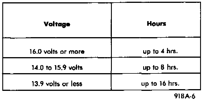 3. Battery chargers vary in the amount of voltage and current they provide. For the time required for the battery to accept measurable charger current at various voltages. If charge current is still not measurable after charging times, the battery should be replaced. If charge current is measurable during charging time, the battery may be good, and charging should be completed in the normal manner.