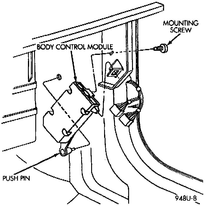 The intermittent wiper function is controlled by the Body Control Module (BCM), located in the passenger compartment behind the right side kick panel. If the Body Control Module is determined to be the problem, refer to Instrument Panels and Systems, for replacement procedures.