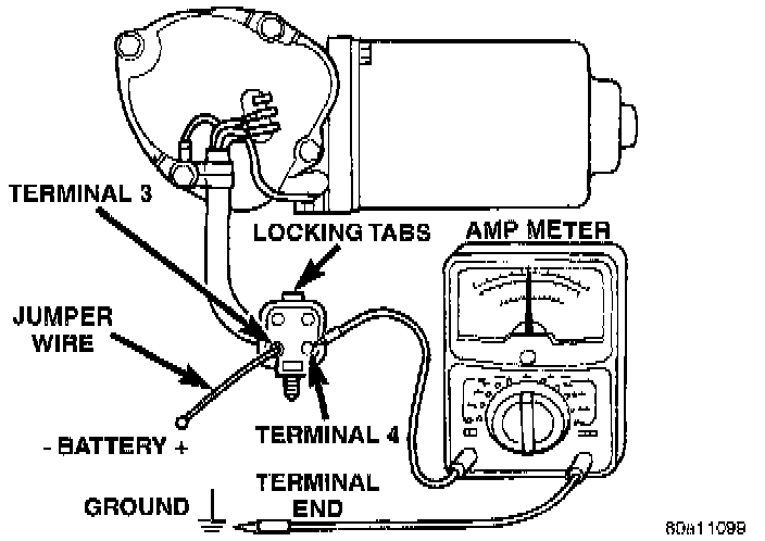 1. Disconnect the wire harness from the wiper motor. Remove wiper arms and blades. Disconnect motor drive link from motor. Connect an ammeter between battery negative jump start terminal and Pin 4 on the wiper motor connector. Connect battery positive wire to Pin 3 on the wiper motor connector. When replacing drive link nut tighten to 11 to 12 N.m (98 to 106 in. lbs.) torque.