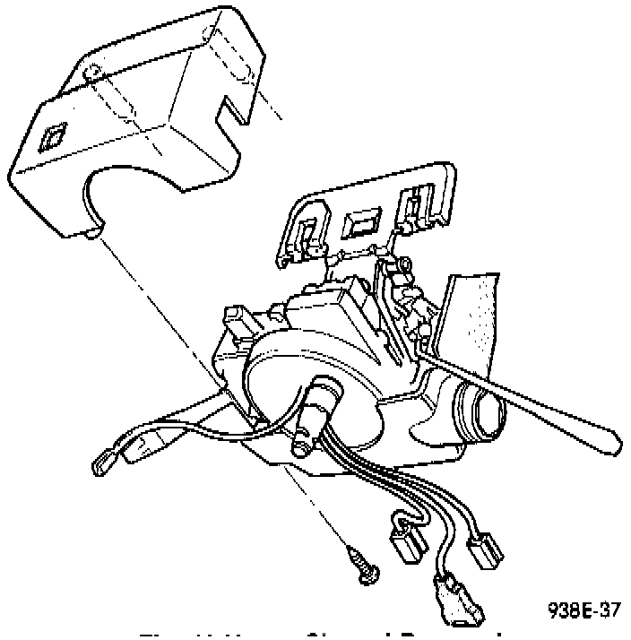4. Using a screwdriver in place of the lever, tilt the column down. Remove the two mounting screws on the switch and remove the switch. Remove the wiring from the hooks and disconnect the two electrical connections on the multi-function switch. Remove the multi-function switch.