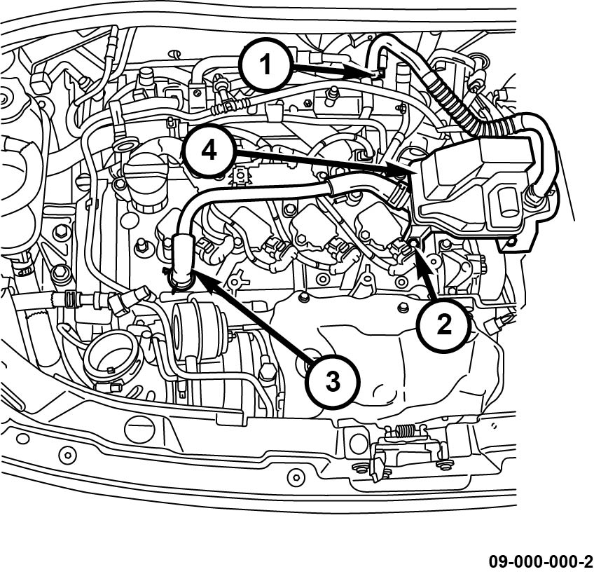 5. Install the oil separator housing (4) to the cylinder head cover with three bolts (2) tightened to 13 Nm (115 in. lbs.).