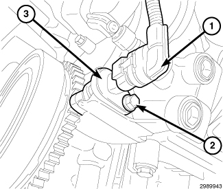 1. Install the crankshaft position sensor (3) with mounting bolt (2). Tighten the mounting bolt to 9 Nm (80 in. lbs.).