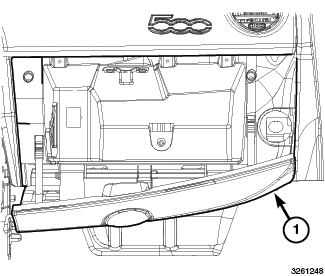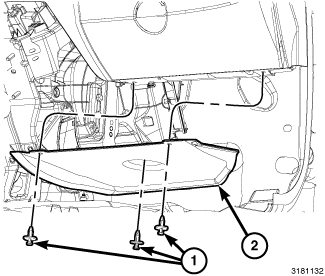 7. Install the passenger side silencer panel (2) and install the retainers (1).