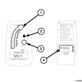 2. Depress any transmitter button, then test each button individually. The special tool will issue an audible beep tone if a satisfactory radio signal strength that lights five or more LED units is detected.