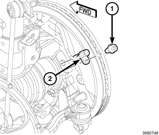 1. Install the wheel speed sensor head (2) into the knuckle. Install the mounting screw (1) and tighten it to 7 Nm (62 in. lbs.).