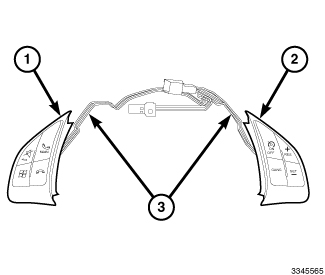 The switch pod housing and push buttons are constructed of molded plastic. Each of the push buttons has International Control and Display Symbol graphics or text applied to it, which clearly identify the function of each push button. The switch pod is secured through integral snap features within the steering wheel spoke cavity and a ledge feature on the inboard side of the switch housing that is captured beneath the edge of the driver airbag trim cover. A pigtail wire harness (3) and connector integral to the speed control switch pod and (if equipped) shared with the Blue And Me switch pod (1) in the left steering wheel spoke connects the switches to the vehicle electrical system through a dedicated take out and connector of the clockspring.