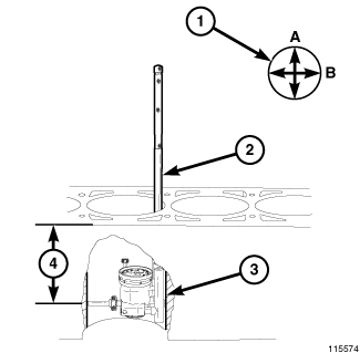 13. Rotate measuring device 90° to point B (1) and repeat the three measurements. Verify that the maximum taper is within specifications Engine Specifications.