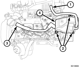 6. Remove three bolts (2) and remove the oil separator housing (4) from the cylinder head cover.