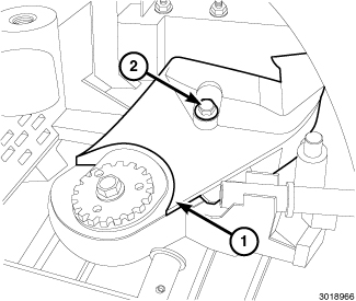 8. Install the Camshaft Timing Locking Tool (10277) (1) to the rear of the camshaft. Rotate the crankshaft vibration damper clockwise to align the tool with the vacuum pump mounting. Install three bolts (2) and tighten to 20 Nm (15 ft. lbs.).