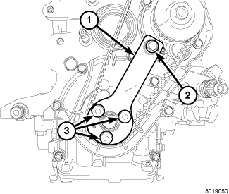 10. Install the Crankshaft Timing Locking Tool (10276) (1) with three bolts (3) tightened to 25 Nm (18 ft. lbs.) and one bolt (2) tightened to 9 Nm (80 in. lbs.).