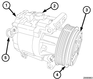 The A/C compressor has the suction port (2) located on the top of the housing, and the discharge port (5) located on the cylinder head, at the rear of the compressor.