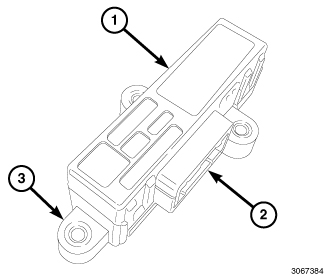 The A/C heater module (1) is a microprocessor designed to operate the heating and A/C system through hardwired circuits. The A/C heater module has a plastic housing with one integral electrical connector receptacle (2) and three mounting tabs (3).