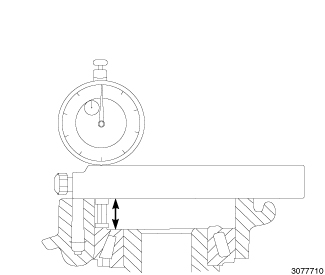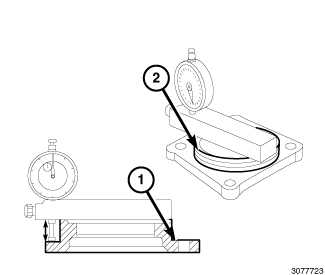 Position a dial indicator (2) with a minimum stroke range of 13mm. Measure and record the distance between the sealing surface of the bearing plate as shown. Use the average of three readings in separate locations.