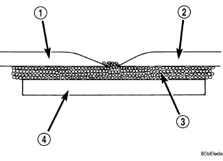 20. Apply adhesive (1) over the mesh (2) around patch (3), and smooth epoxy with a wide spreader (4) to reduce finish grinding. Use two to three layers of mesh and adhesive to create a stronger repair.