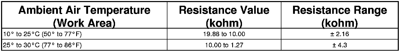 4. Use an ohm meter and check the resistance between pins 1 and 2 of the evaporator temperature sensor. Compare the temperature of the work area to the found resistance value. The resistance should be within the specifications listed in the Resistance and Temperature chart. If not OK, replace the evaporator temperature sensor.