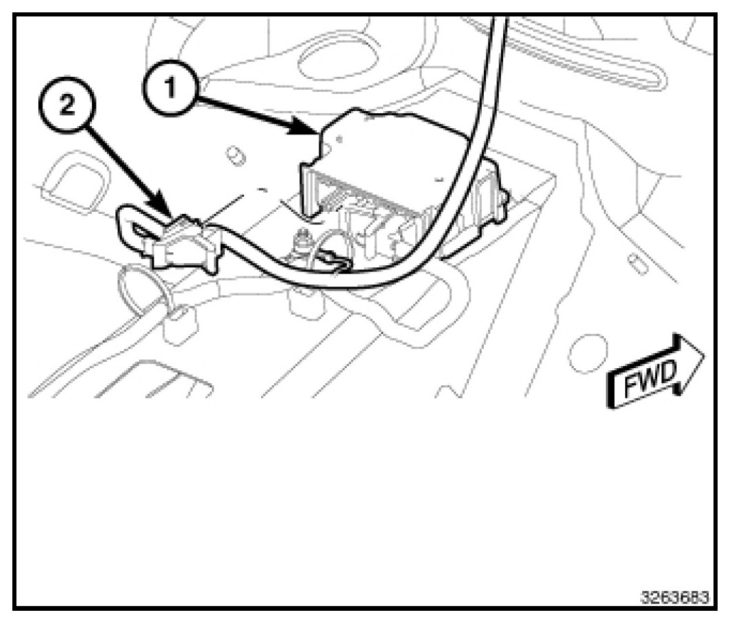 4. Working from the driver side front of the floor panel transmission tunnel, reconnect and latch the instrument panel wire harness connector (2) to the driver side ORC (1) connector receptacle located on the rearward facing side of the module. Be certain that the latch on the connector is fully engaged.