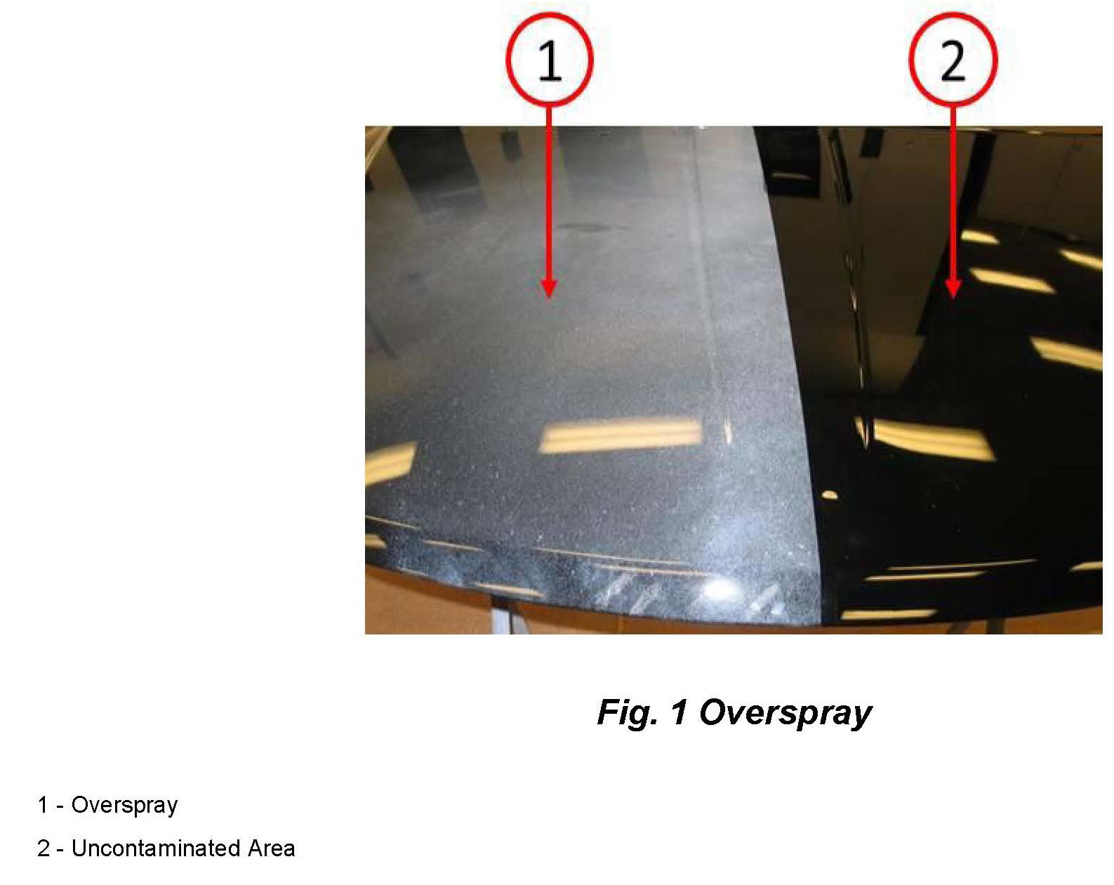 Depending on the severity and extent of overspray on painted surfaces the removal process will vary. Always begin using the least aggressive method. An example of overspray is shown in (Fig. 1).