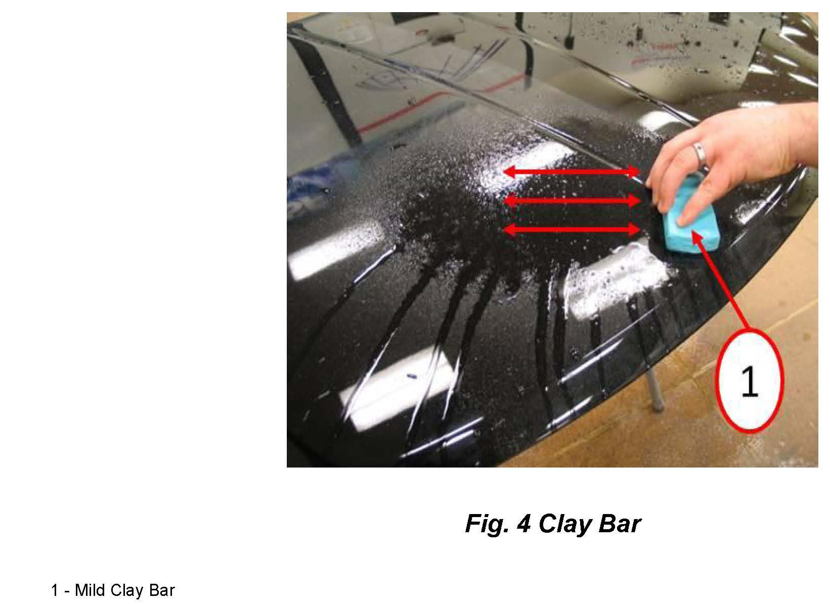 3. Using a clay bar work in a unidirectional pattern while the detail spray applied in Step # 2 is still wet as shown in (Fig. 4).