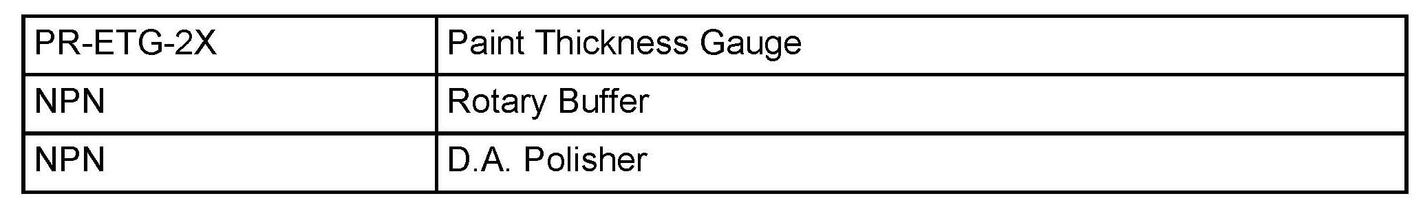 A rotary buffer must be used by a trained technician as it can permanently damage the painted surface if not used correctly. Damaged areas can only be repaired by refinishing the affected vehicle panel. Prior to using a rotary buffer measure the paint thickness using Gauge # PR-ETG-2X or equivalent to determine clearcoat or single-stage paint thickness before and after the repair.