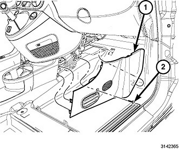 3. Remove the screw (2) that secures the passenger side console closeout cover (1).
