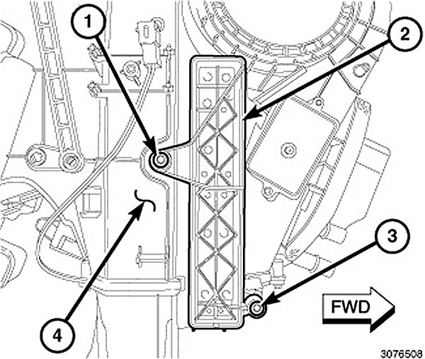 6. Remove the two screws (1 and 3) that secure the particulate air filter cover (2) to the right side of the HVAC housing (4) and remove the cover.